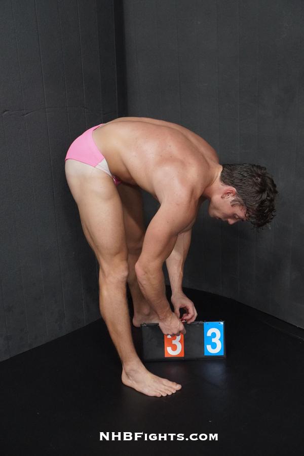 Both men wriggle and resist, as Scrappy’s flawless body ripples with every muscular choice. Ethan tries his best move again, simply pressing his chest against Scrappy’s. Scrappy fights to get back up to his knees, and once again misses his chance to get Ethan in a tight hold. This is officially a one-sided bout, with a final score of 1 / 6.