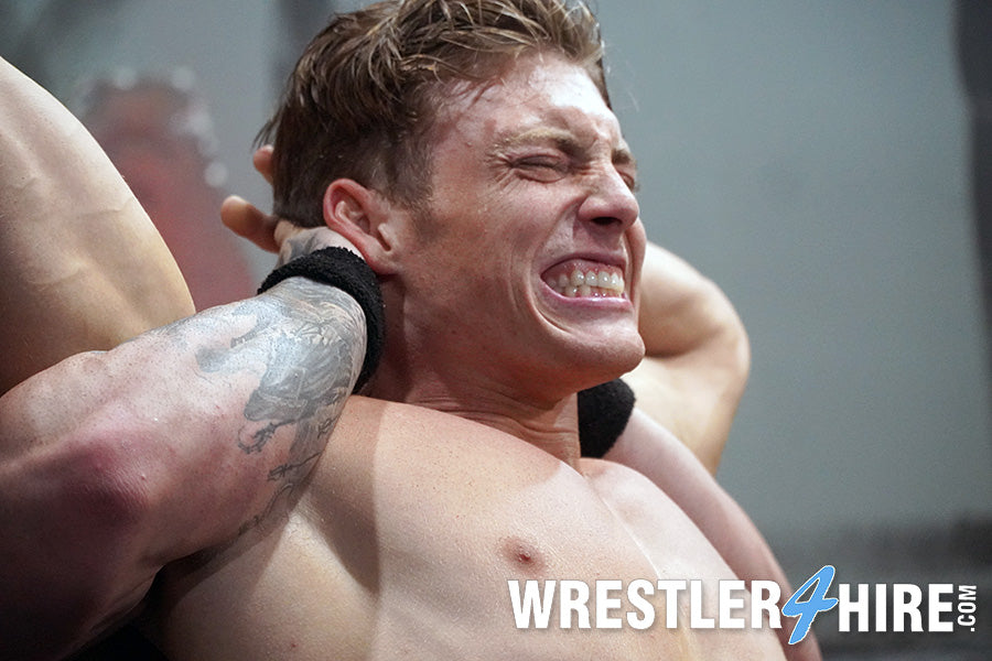 Squeezes, chokes, Boston crabs! Gunnar begins to sweat like a pig as he wrecks a cursing Scrappy. Even after all the beatings, Scrappy still wants Gunnar to flex for him. Gunnar obliges, only to be surprised by a vengeful newbie, who knows a slew of brutal holds as well. Scrappy’s young, smooth, dry, soft skin rubs against Gunnar’s sweaty frame in an almost intimate exchange of power.