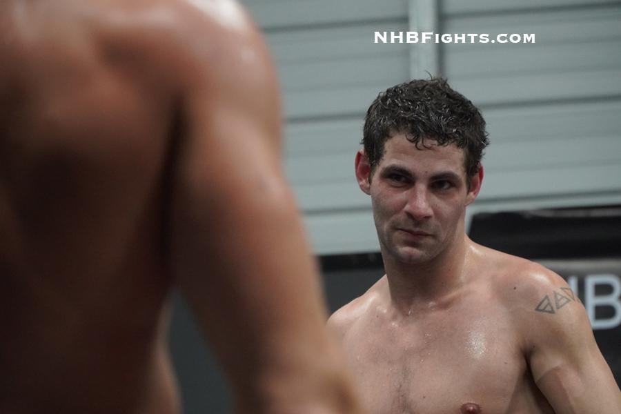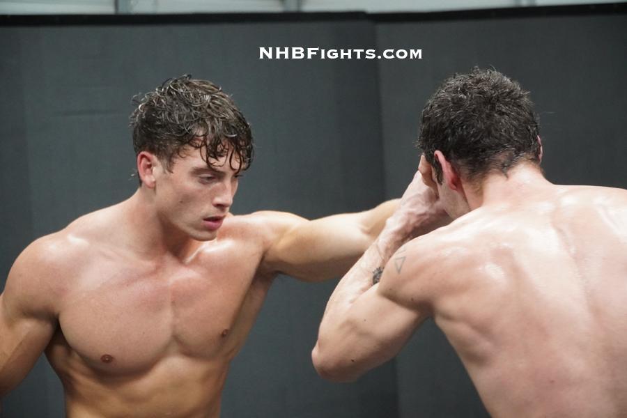 Wolfboy is usually better on the mat. Scrappy is only just discovering how skilled he can be if he stays on his feet. Wolfboy desperately fights to get the bodybuilder down, practically smothering his face in a variation on the schoolboy pin. This is one NHB fight that sees the combatants struggling to either stand or go to the mat, and the sweaty match ends in a close score, and a powerful flex from the winner, who also uses his foot to step on the loser to frame his humiliation once and for all.