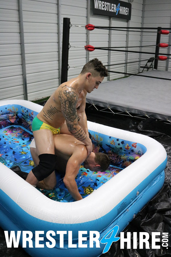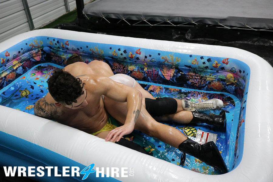 Marco and Scrappy climb into the pool, both noticeably quieter than usual. The intimacy of oil application seems to have silenced the competitive clowns. The sloshing sounds of oil on skin fill the air, as tighty whities turn utterly transparent, and two dudes accustomed to having their way in the ring find themselves at the mercy of slippery skin and oil.