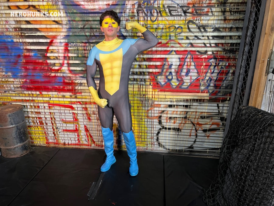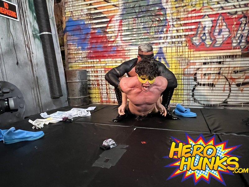 Sky Atlas lives by one motto and one motto only, "Truth, Justice and the Super-Hero way!". As he proclaims this, from out of camera comes Hardcastle, who despises what he has just heard and tells Sky Atlas that being a villain is the only right way to live. Not one to back down in the face of villainy, the two immediately go at, with Hardcastle picking Sky Atlas up by the neck in a chokehold, before depositing him back on the ground, where he can go to work on the toned body of the super-hero stud. Before long, Sky Atlas is feeling Hardcastle's power!
