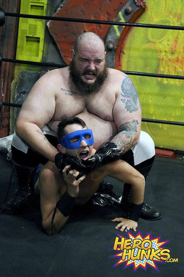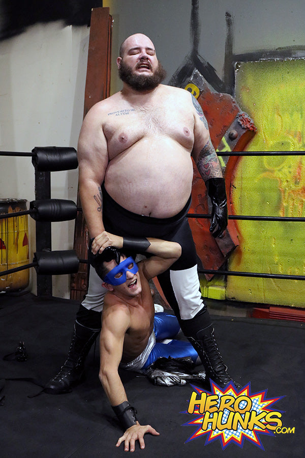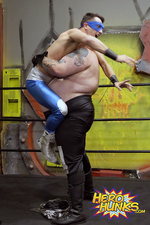 Make no mistake, when Dr. Maniacal is in control there is no mercy on Slash and the hero is pounded, splashed, body slammed and otherwise punished throughout the ring. Stripped to just a blue thong, Slash’s abs are dominated, he is the victim of ball grabs and other humiliating domination. There is something entirely enticing watching a smaller man unable to escape the clutches of a larger man, knowing that however hard he tries, it will never be enough.