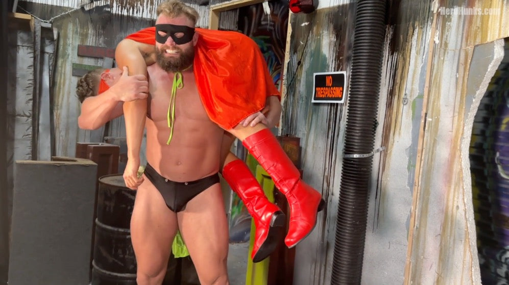 More low blows lead to a backbreaker over Thunder's knee and finally to the ultimate humiliation for any hero. Thunder removes the mask of Solar, exposing his secret identity to the world. Thunder then begins his final onslaught with more ab and trap claws followed by a bearnug and then a wedgie that goes on for an extended period of time. Once he feels as though he has had his fun, the only thing left is to put Solar out of his misery, and so we are witness to a straightout choke in which we see Solar slowly slip away, his eyes rolling to the back of his head, his attachment to the waking world going further and further away. An incredible display of a dastardly villain totally owning a superhero.