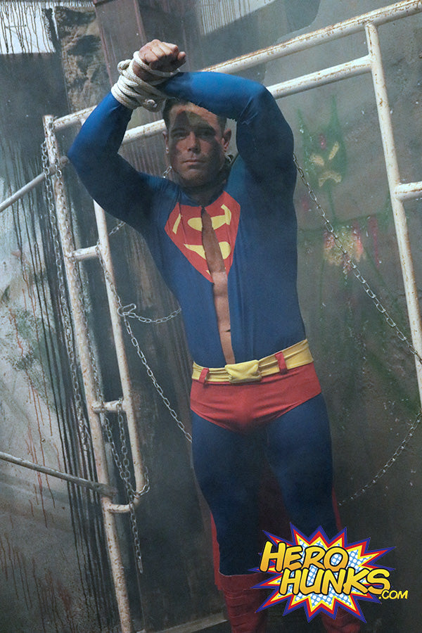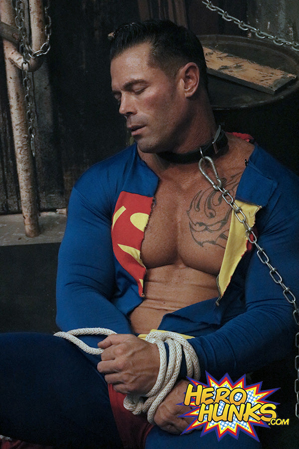Already unconscious, collared, chained with wrists bound, Steel Man is at the mercy of our evil villain. What follows is a 20-minute deconstruction of a helpless hero by an evil sadistic madman. Dark Decipter goes to work on the abs, pecs, back, legs and every other part of the moaning Steel Man.