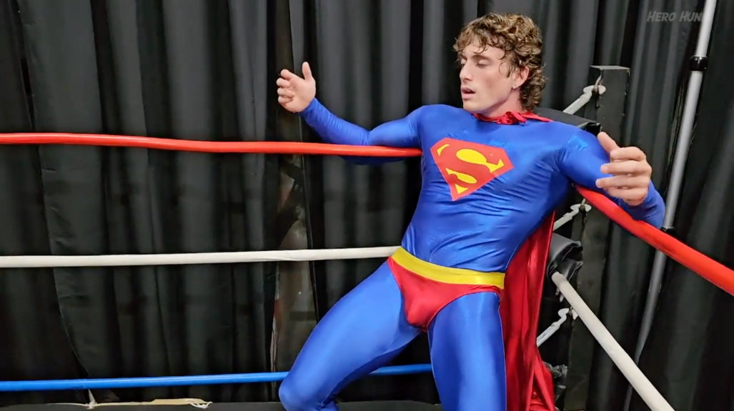 What starts as a battle of muscle and wrestling holds quickly turns into something more erotic. Sweat-soaked torsos slam together, pecs grinding, bulges straining, lips touching in heated passion between gut punches, humiliating holds & taunting tricks. Steel Man feels himself fading — power sapping serum coursing through Tanner’s veins gives the villain the edge. Soon the mighty hero is on his knees, cape around his neck like a leash, submitting to Tanner’s dominance.