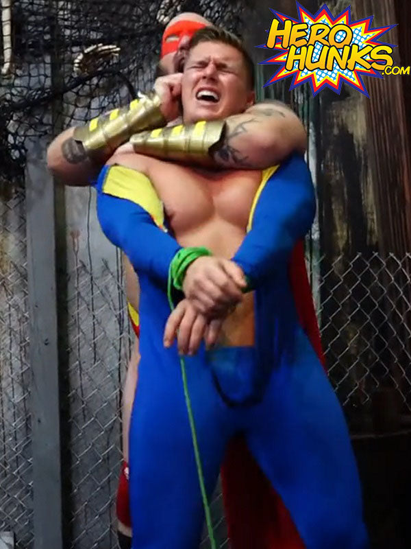 We join the action with Steel Man already tied up with Kryptonite rope, depleting his powers. His costume town and is body at the mercy of Dr. Maniacal. As bad as things look for our helpless hero, he quickly learns that things can get worse….much worse. A huge mountain of a man, when Dr. Maniacal puts his entire weight behind a full nelson or blows to the back, they have a devastating effect on Steel Man. Some nipple twists, pec claws and boots to the crotch have our hero screaming out in pain.