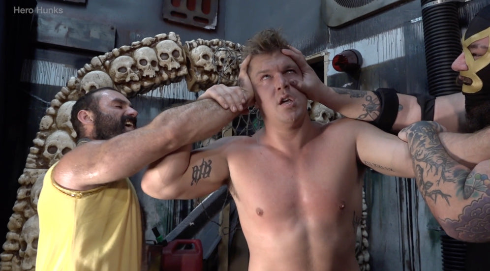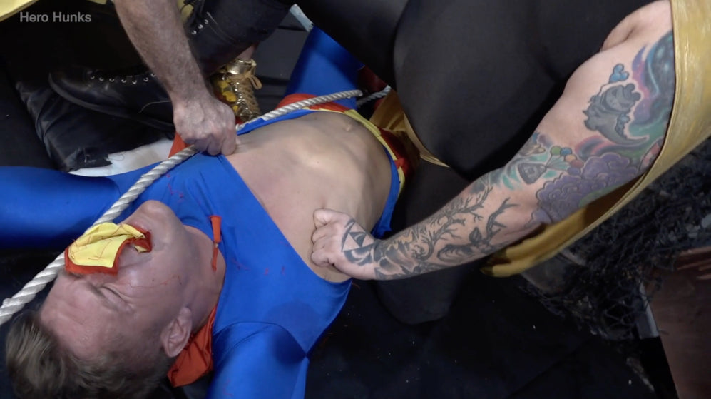 When both Golden Terror and Golden Wheeler put their boots on the back of a prone Steel Man, the combined weight causes our hero to scream in pain. Turning Steel Man over, Golden Terror plants himself right on the hero's chest, the mountain of a man causing devastating pressure on Steel Man's chest and abdomen. A moment of opportunity leads Golden Wheeler to jump in and deliver his own punishment, including a stomp onto the bound hero's crotch. As the two really get going, it is time to issue the absolute humiliation, as the deviant pair cut (with scissors), rip and tear the very costume off the helpless hero, leaving him in only a very small red shiny speedo. Nipple twists and wedgies are next on the menu, mixed with lots of punishment and domination to Steel Man's groin. He collapses to the ground, clearly unable to take any more.