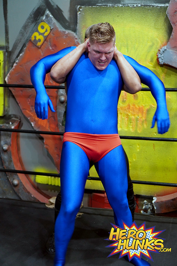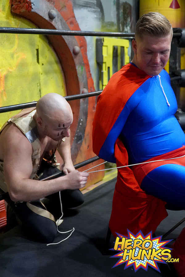 What’s hotter than a helpless hero being dominated by an evil villain? How about a helpless hero being dominated by TWO evil villains. Bound, seated and hooded, Steel Man knows the location of the missiles, and the Squad Raiders are determined to get the information from him. His refusal to tell only leads to pec and ab claws, gut punches, a devastating headlock and nut grabs.