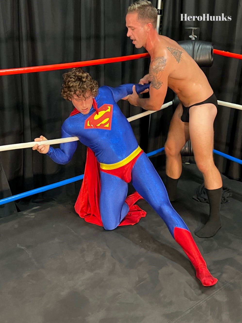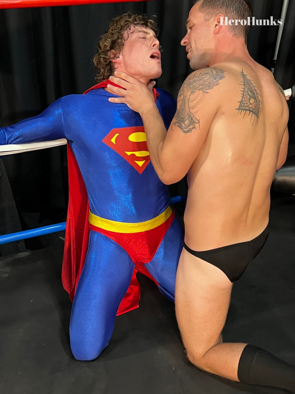 This ranks as one of THE BEST hero beatdowns to date. The way Scrappy’s muscles fill out the suit is near perfection. And the way Tanner manhandles him is even better. Seeing Steel Man humbled at the bully’s feet is fire. An even hotter & “harder” sequel needs happening