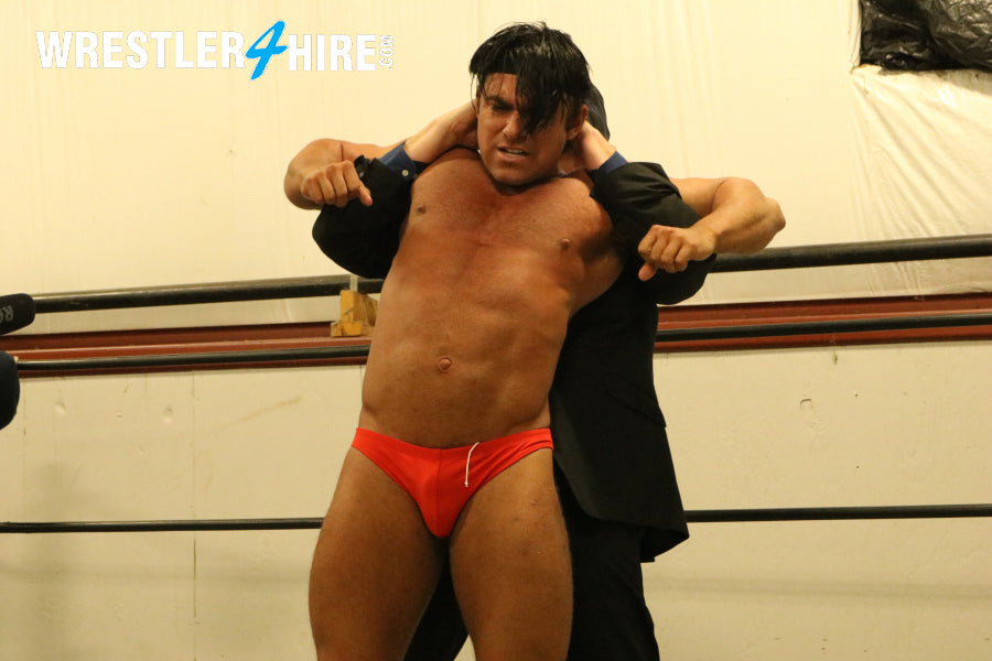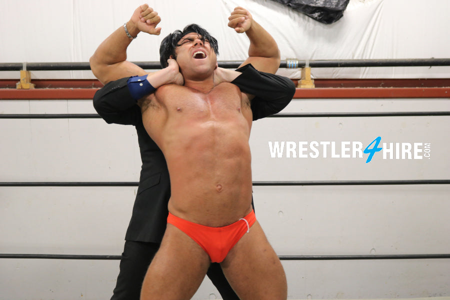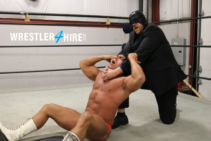 The masked, demented Quivers plows Roman over silently, crushing his hard muscle gut, then pulling his arms over his head, exposing deep, sexy armpits. Quivers moans as he puts on the pain, showing that it ain’t easy to outmuscle Roman. Roman’s sweaty, raven hair swings as he rocks back and forth looking for an out. He falls, and Quivers falls on top, grinding him into the floor with his own clenching strength.