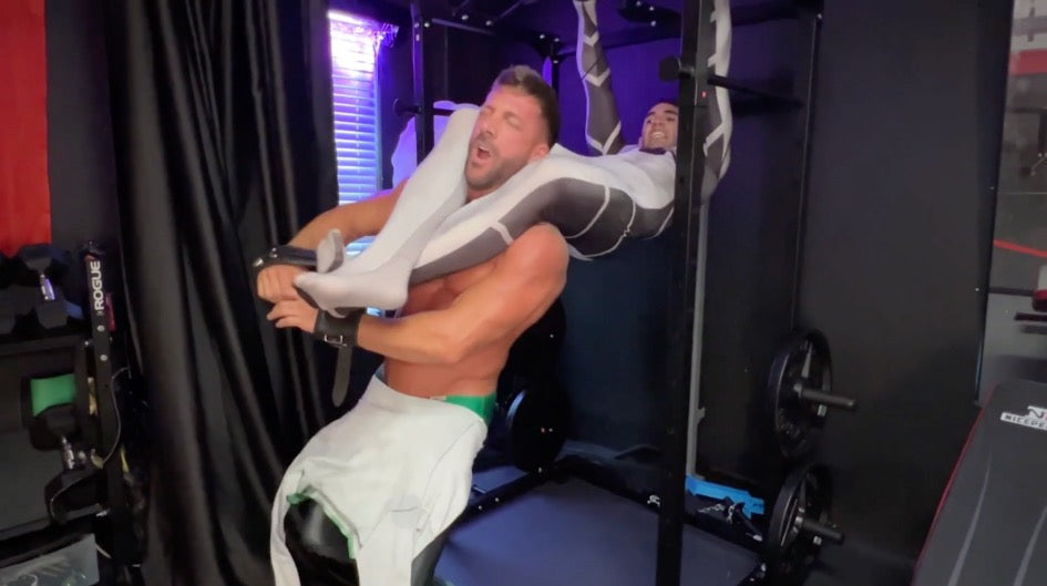 Just when it seems like they’re back to business, Verde strikes with a sneak attack, catching Blanco off guard. The gym erupts in a storm of testosterone as they grapple fiercely. Verde’s suit gets unzipped in the chaos, revealing his sculpted abs and broad, powerful chest—a true Adonis in action.