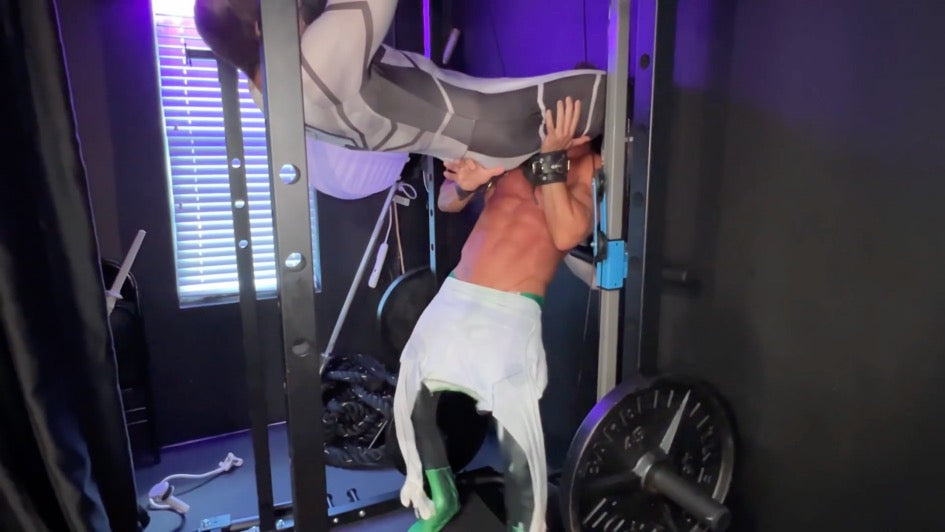 In the city’s secret underground gym, Verde trains tirelessly to protect the streets, his black and green bodysuit clinging to every rippling muscle. But the intense atmosphere lightens the moment Blanco arrives—playful, cocky, and irresistible in his pristine, body-hugging white suit. Blanco's youthful mischief can’t resist stirring things up, playfully taunting the stoic Verde. What starts as a friendly training session quickly heats up into a full-blown sparring match. Sweat flies, bodies collide—these heroes are locked in a raw, electric clash of wills. Muscles strain as they struggle for dominance, each determined to show who’s boss.