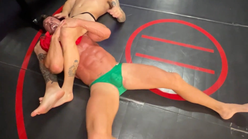 Blanco seizes the moment, leather restraints snapping around Verde’s wrists. With a wicked smile, he executes leaping headscissor attacks, his thighs wrapping around Verde's face with taunting ease. Each thrust, each flex of Blanco’s powerful legs, forces Verde deeper into humiliation, leaving the senior hero gasping and powerless. Verde can only writhe, his muscles bulging helplessly against his bindings, Blanco’s grin growing wider with every passing second.
