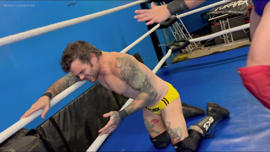 Max Nasty quickly became a standout for me. Though smaller than his two opponents, he brought intensity and unrelenting energy to the match. With technical pro wrestling skills, a BJJ background, and a collection of cool tattoos, he’s clearly a force to be reckoned with. Oh, and it’s obvious he’s in a band—he’s definitely the drummer.