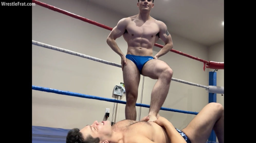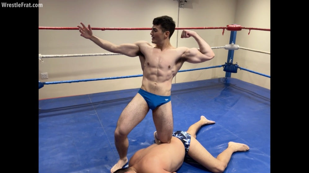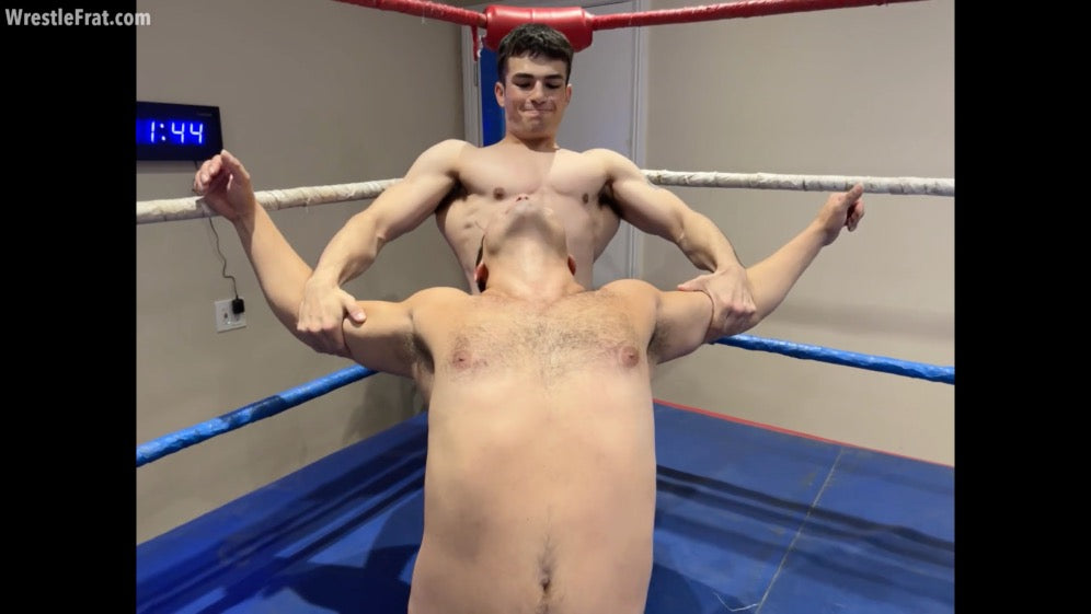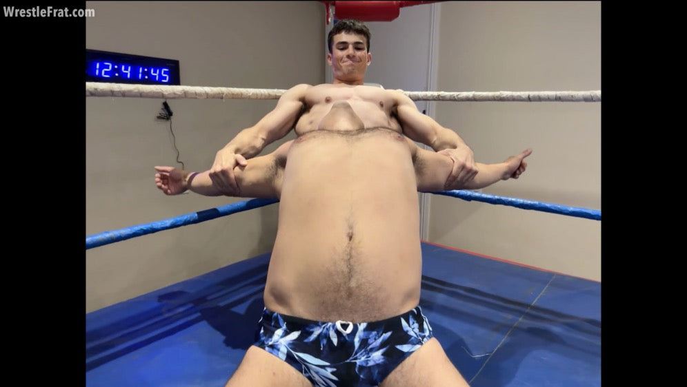 Jonny’s frustration is palpable, the humiliation setting in as this fresh-faced, novice bodybuilder controls the action. Jonny could easily outmatch him in a real fight, but today, he’s helpless, forced to endure the raw strength of a newcomer who’s loving every second of it.