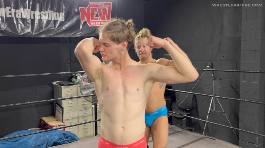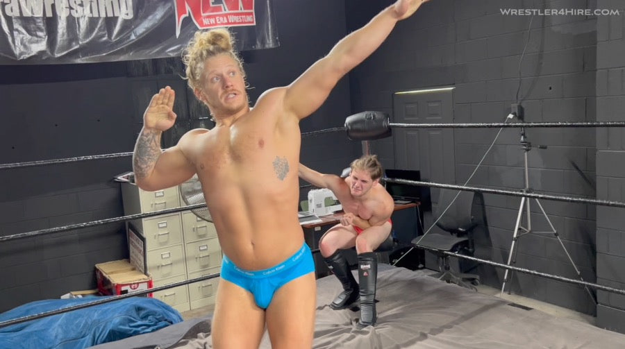 As Tristan is in the ring, extolling his own virtues and admiring his physique, Jack Dillon approaches from behind and after mimicking him behind his back, delivers a blow that sends Tristan to the mat. Trapped in the ropes, Jack tells Tristan that they are to have a 2 out of 3 fall match, submission only, with the loser of each fall having to kiss the winners feet. Oh, and as an added humiliation, the ultimate loser also has to put on a dress. Although not really wanting to participate in the match, Tristan is convinced to do so as Jack continues his assault on the young grappler's back.