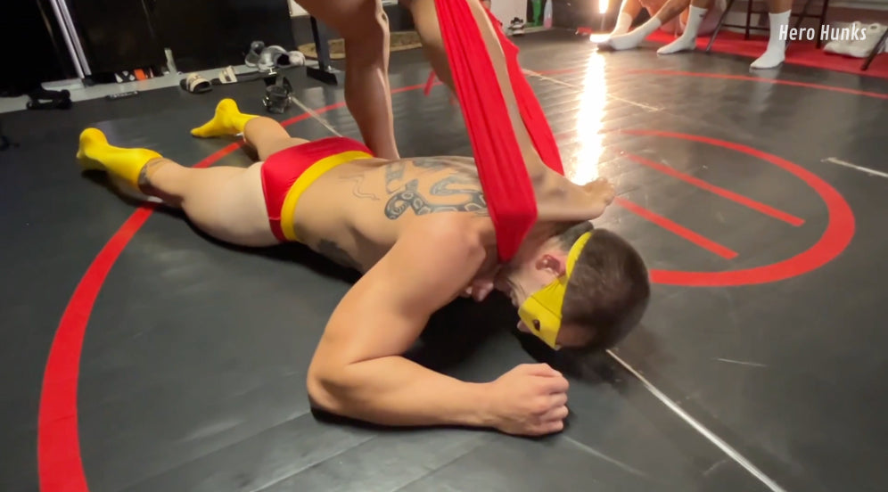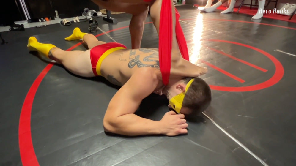 But Gut Punch Man fights dirty — real dirty. A low blow drops Vinny to his knees, clutching his aching nuts and gasping for air. The villain wraps the hero’s cape around his neck, throttling him while flexing proudly over the fallen do-gooder. A super wedgie adds to the humiliation as the superhero has had his identity revealed and now is being put to shame. A sleeper hold finishes the job.