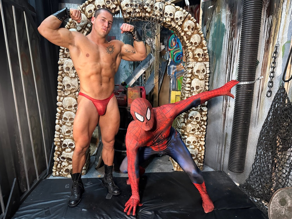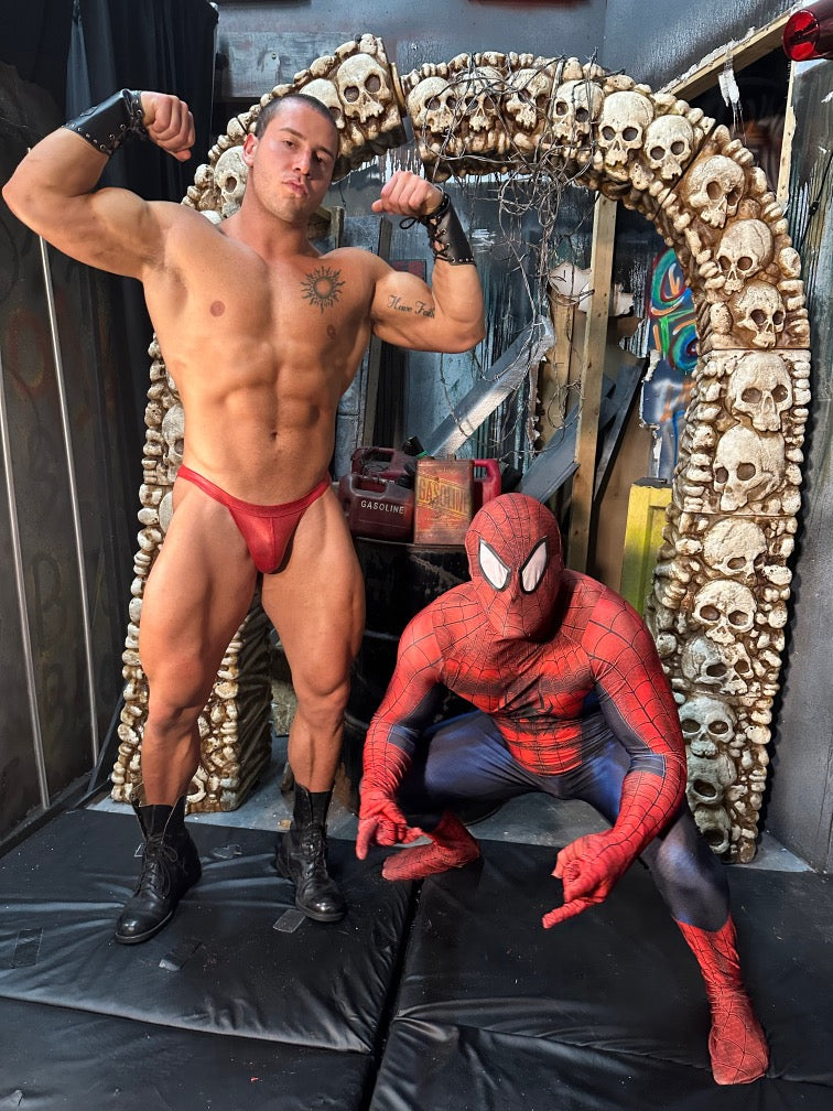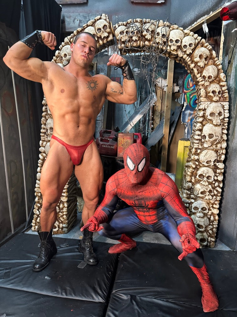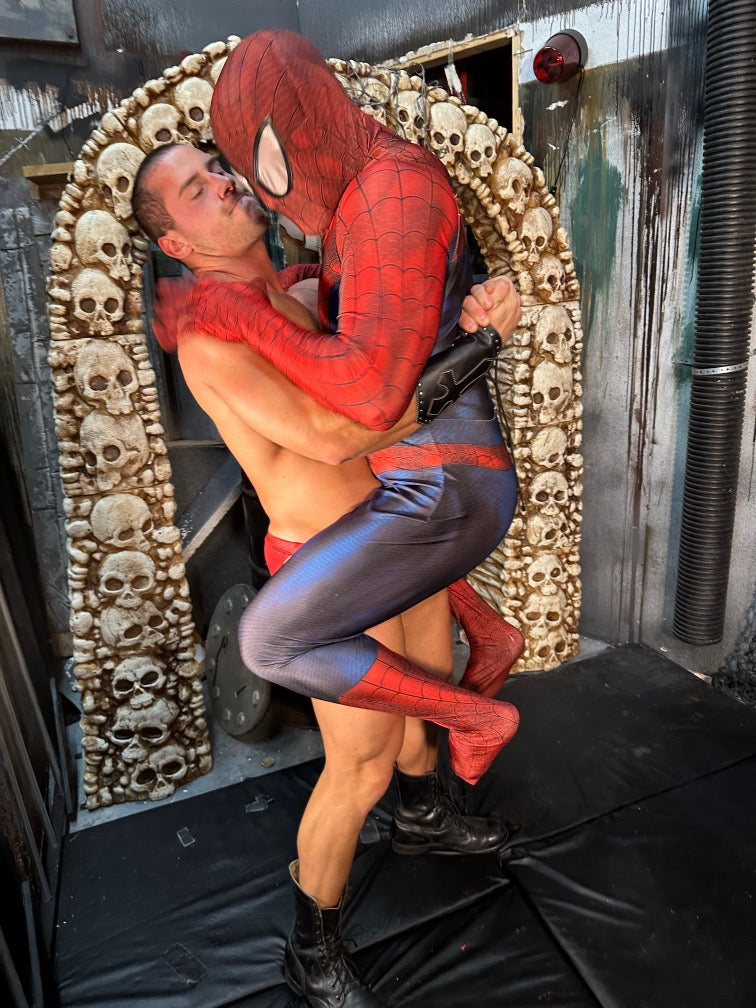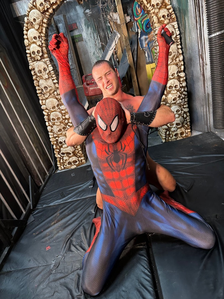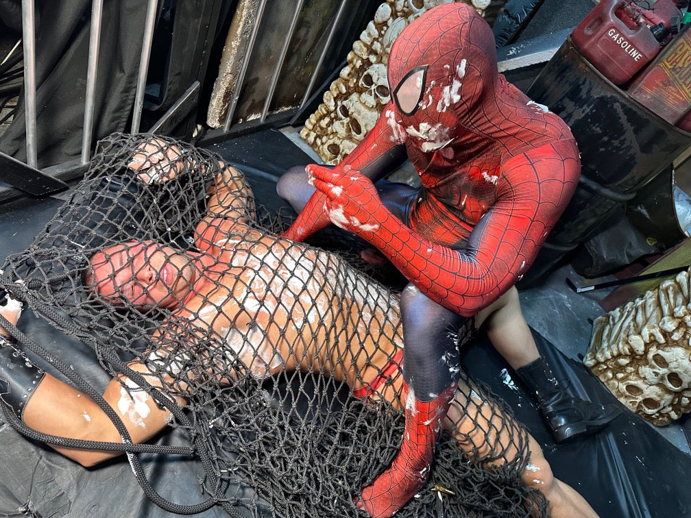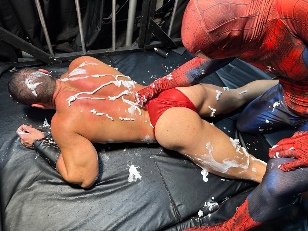 Web Wonder doesn't stop there, however, and soon Web Wonder has sprayed the white substance on the entire leg and upper body of Super Bronco, which saps the villain of his power and ability to fight back. Web Wonder goes about rubbing the white substance into the skin of Super Bronco, and with each application, Super Bronco loses more and more power. When Web Wonder applies it directly to Super Bronco's crotch, the villains screams of pain grow louder. Turning the villain over, now the back side of Super Bronco gets covered in the substance and soon all Super Bronco can do is spasm from the pain, as Web Wonder rubs into every part of the villain's body. Once the canister is empty, Web Wonder decides it is time to capture the villain (which he does with a nearby net) ready to take him away and await a fate that only the two of them will be privy to. A great concept of a villain and a hero with the introduction of powerful control substance that I know you will enjoy!