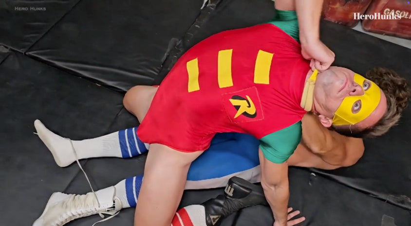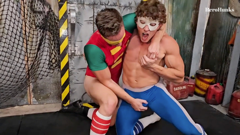 Dressed in boots and classic knee-high white-with-stripes socks, the two pretty-boy heroes go at it hard, determined to humiliate and crush the other into submission. Costumes are ripped away, leaving them stripped down to just their masks, thongs, and socks—sweaty, furious, and refusing to back down.