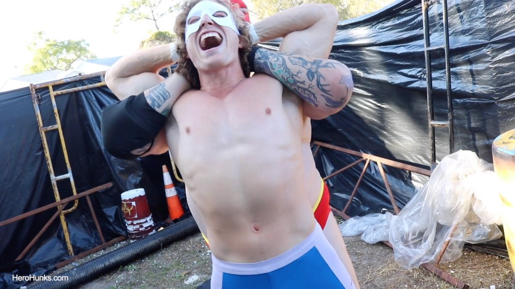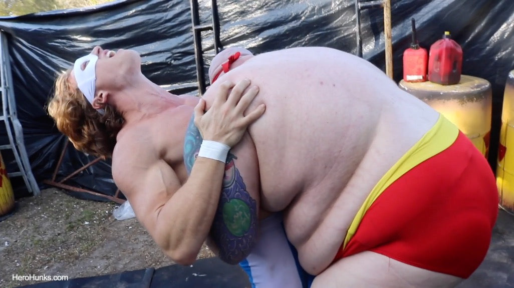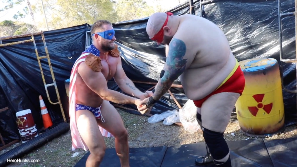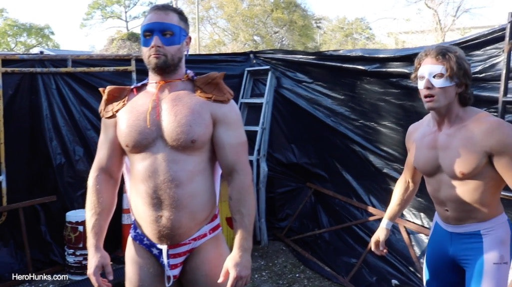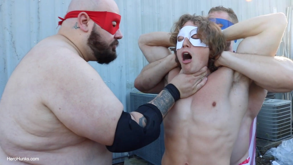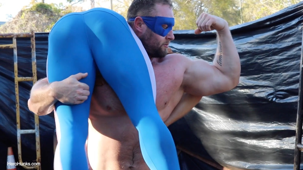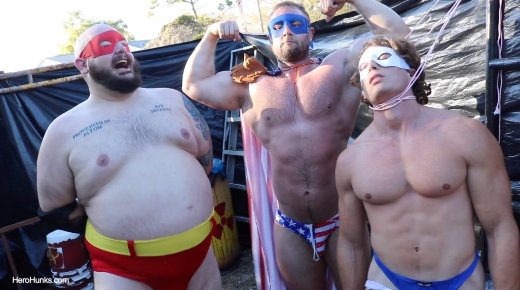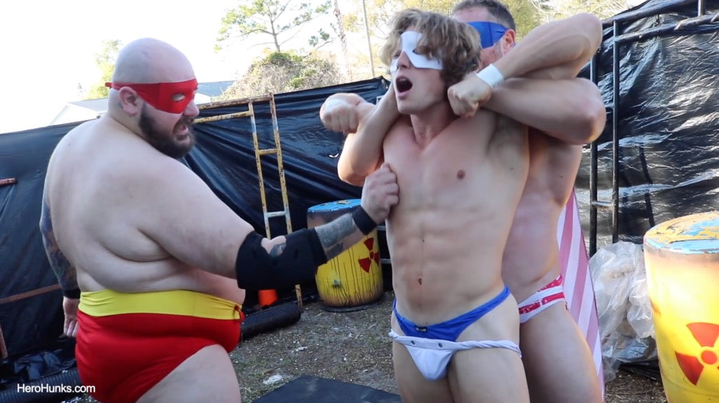 The situation quickly devolves into a 2 on 1 as White Wolf not only has to try and stop Dr. Maniacal, but also hope to keep the Patriot at bay. Caught in the Patriot's devastating beahug, White Wolf is quickly stripped down to just a blue thong as both Dr. Maniacal and the Patriot take turns applying very tight ball grabs. Once White Wolf has been defeated, he is choked out with a rope, and then strung up like so much garbage, left as a warning to other heroes who may attempt to stop Dr. Maniacal's plans...they could end up in a similar or worse situation!