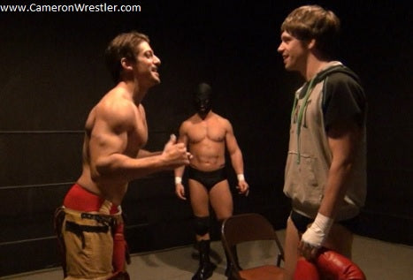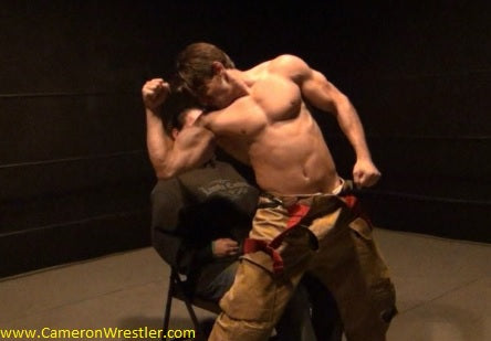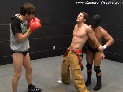 Ethan and Dr. X go right to town on Z-Man. Starting with his world-class abs, they dominate Z-Man the whole time. Ethan has taped his fist for more impact. He even brought his boxing gloves to toy with the defenseless victim. It isn't long before they strip the heavy firefighter pants off their opponent to reveal small, bright red, firefighter-esque speedos. This could be embarrassing, but Z-Man isn't shy.