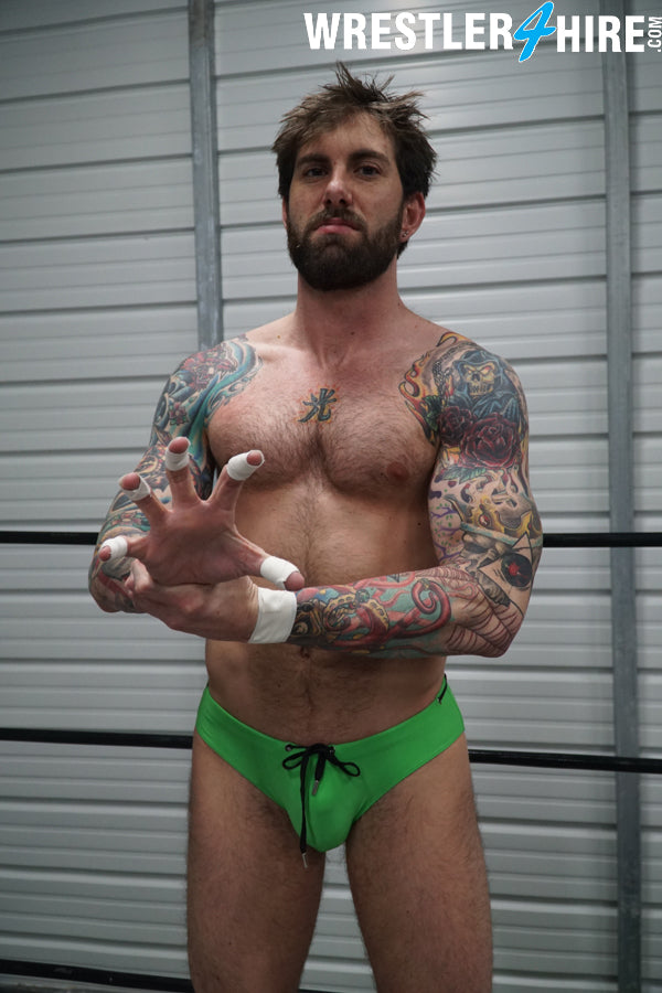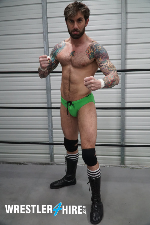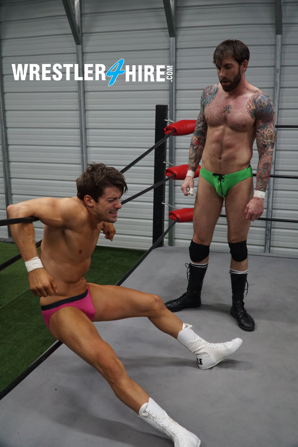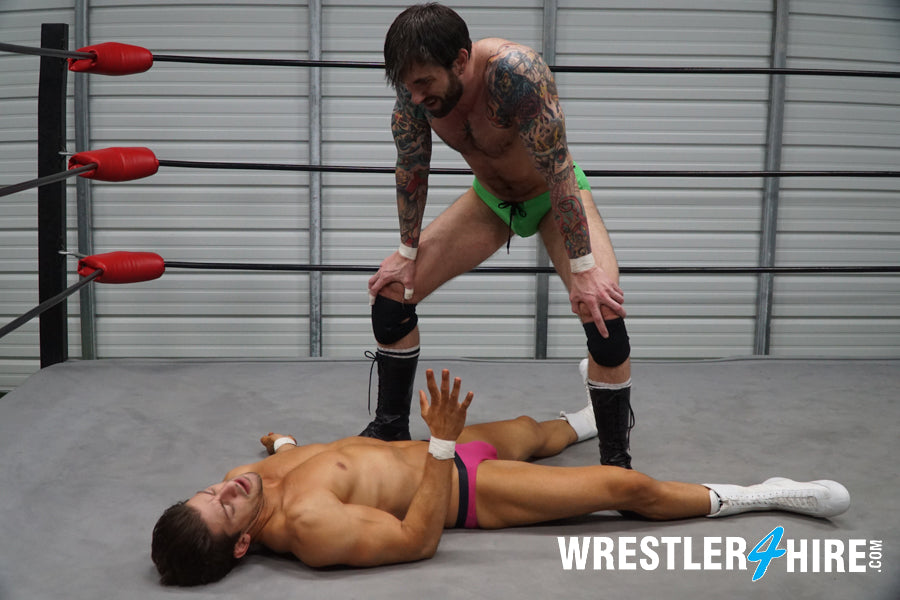KARN drives Z-Man’s face into his own knee, then pounds him hard before taking a handful of that pretty-boy hair and bending him over his lag to claw those spray-tanned abs. Legs are twisted and tangled like wet ropes, boots are used for leverage to inflict further pain. Z-Man tries to crawl away from his hairy opponent, then dives back in to torture his arms and abs with fists and feet.