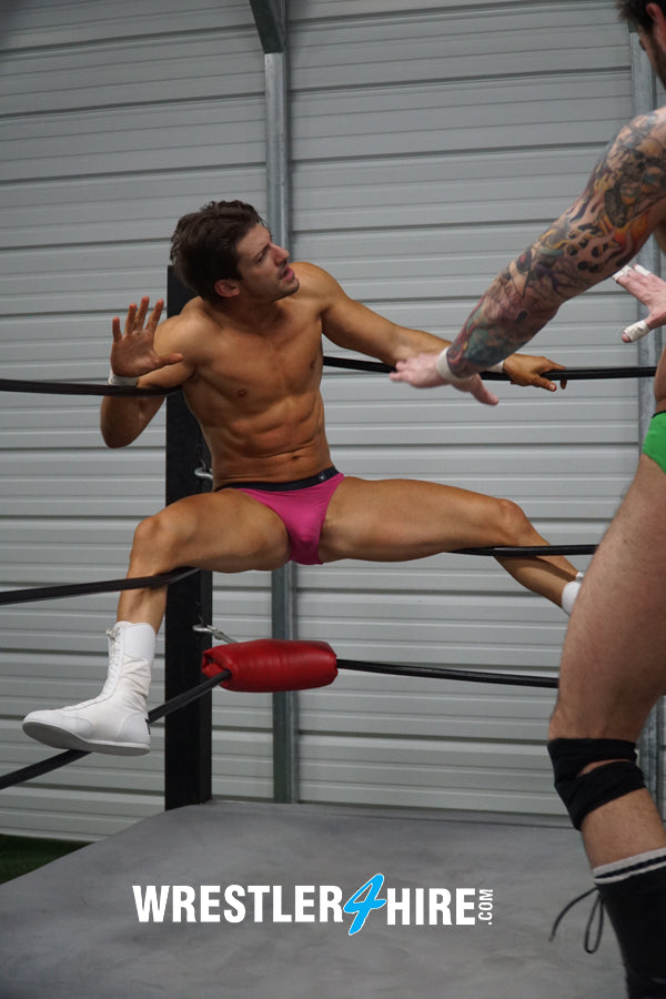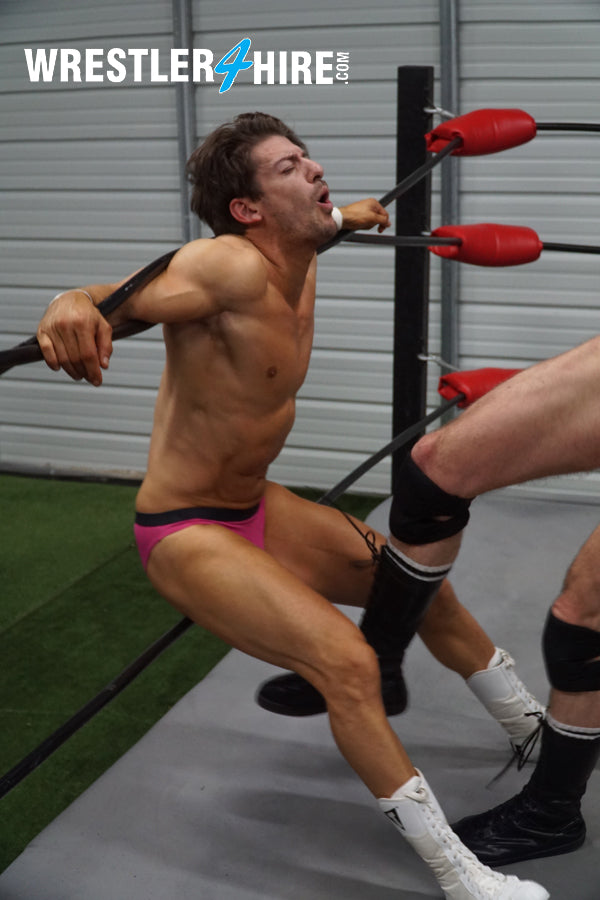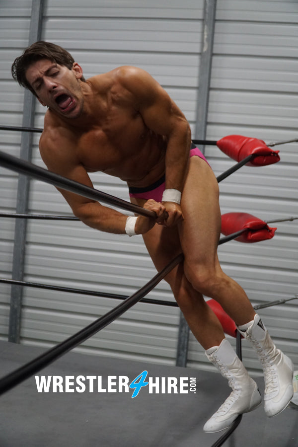 But KARN’s got endurance over the pretty-boy, eventually wearing his down so much he’s able to leave him in the middle of the ring to try out some aerial tricks, leaping down from the top rope to crush and humiliate Z-Man further. There’s a poetic beauty in watching Z-Man writhe, beg, and suffer. But can he recover his strength and stamina to get his revenge on KARN, or will he cry like a little baby?